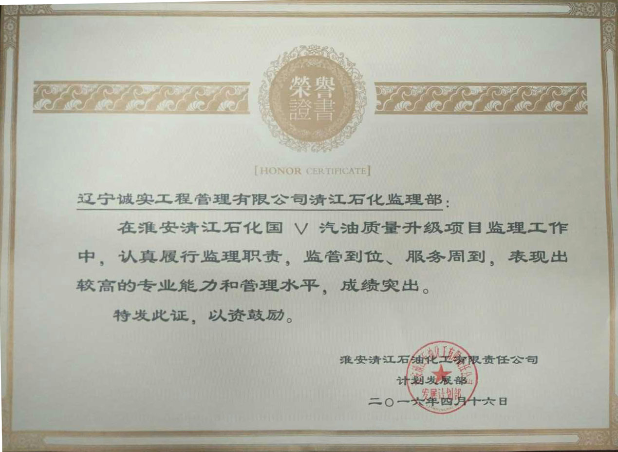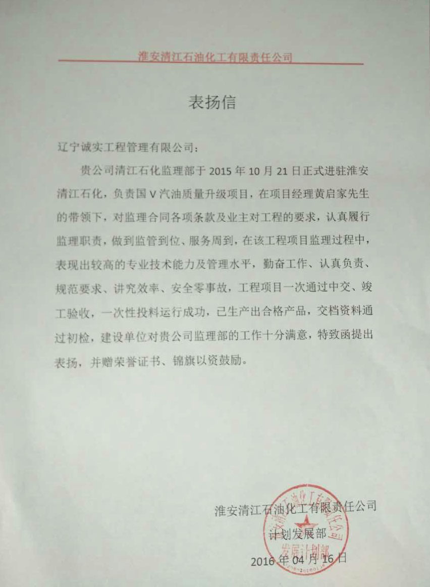 我公司監理人員在“中石化淮安清江石油化工有限責任公司國Ⅴ汽油質量升級項目”工程監理服務工作中,得到了建設單位的一致認可和肯定,對我們的工作表示十分滿意,特發函提出表揚,并贈與榮譽證書、錦旗以資鼓勵。